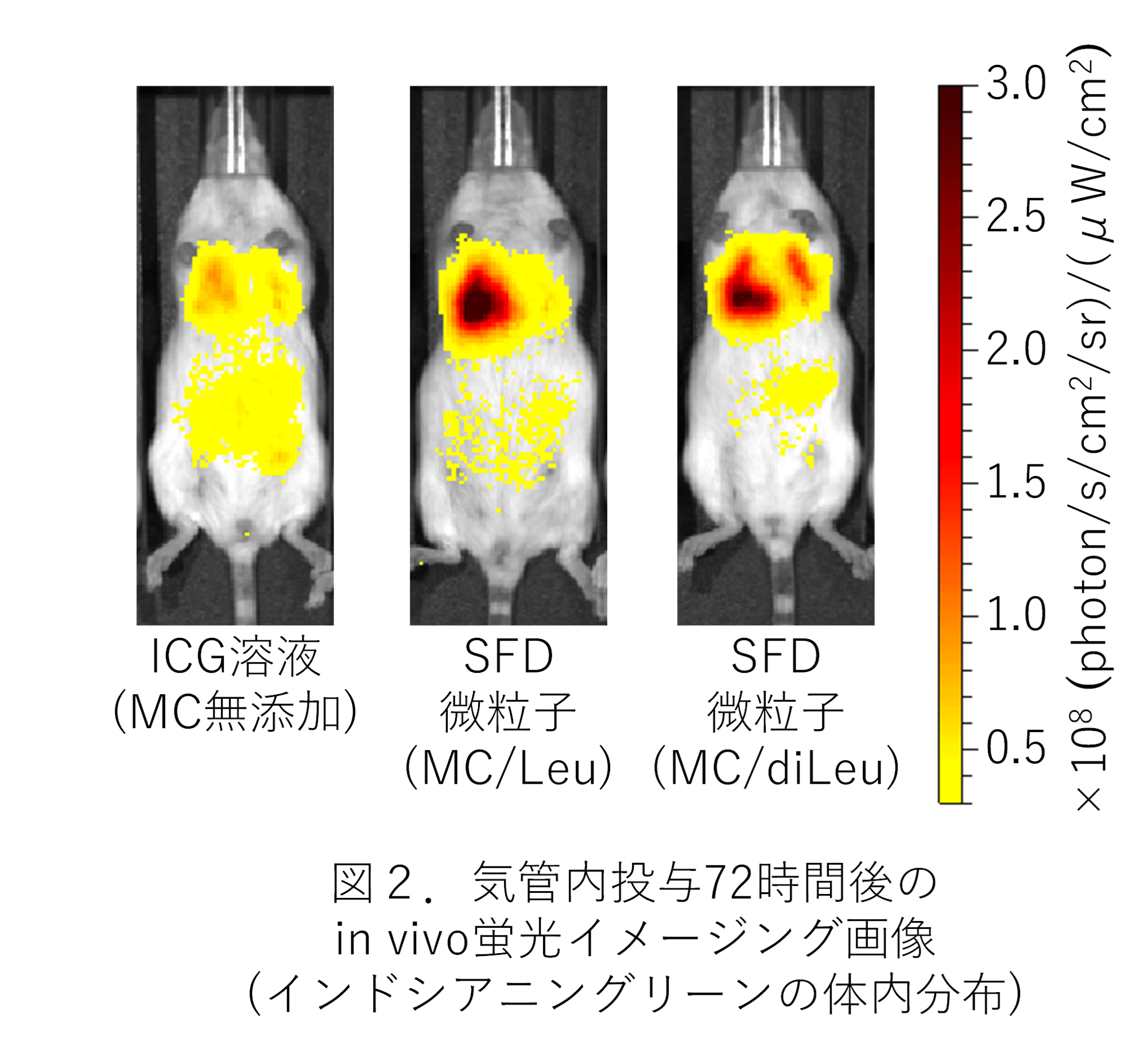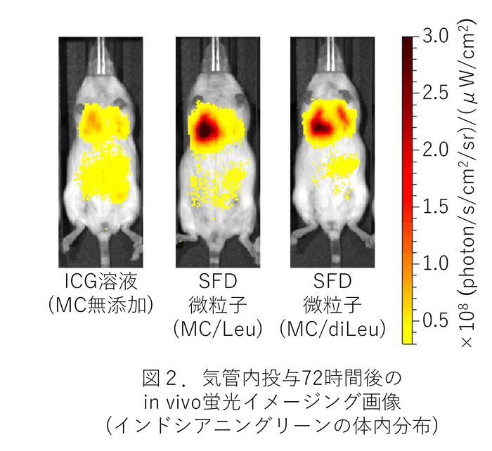 これらのSFD微粒子をマウスに気管内投与した後、モデル薬物として含有したインドシアニングリーン由来の近赤外蛍光をin vivo蛍光イメージング注3)により経時的に検出・解析した結果、MCを含む水溶液と同様にSFD微粒子でも、MCを含まないICG水溶液と比べて肺局所でより長時間にわたり強い蛍光が検出され、MC含有による肺内での薬物滞留性の向上効果が示唆されました (図2)。一方、肺障害性マーカーとして測定した体重・肺重量・動脈血酸素飽和度・気管支肺胞洗浄液注4)中の有核細胞数に変化はみられず、これらのSFD微粒子の高い安全性が窺えました。