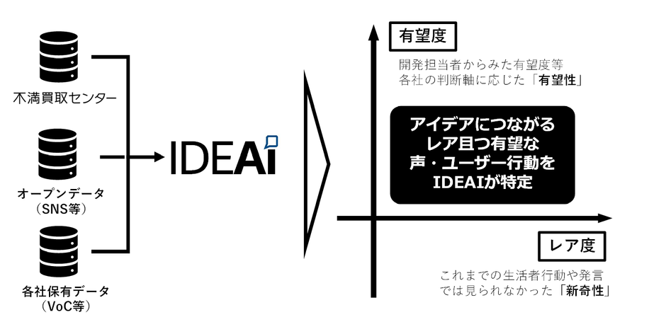 「IDEAI(アイデアイ)」は生活者が感じる不満のビッグデータ1件1件の「新奇性(新しさ、レアさ)」及び「有望度(自社にとっての有望さ)」をAIで自動的にスコアリング(定量的に評価)します。特に「有望度」に関しては各社の商品企画ポリシーを学習したAIを用いた評価により、「自社にあった商品企画」に向けたアイデア創発をサポートします。AIによる絞り込みを行うことで、これまで主に人の主観・知見に頼って行われてきた商品コンセプト立案プロセスのデジタルシフトを実現します。