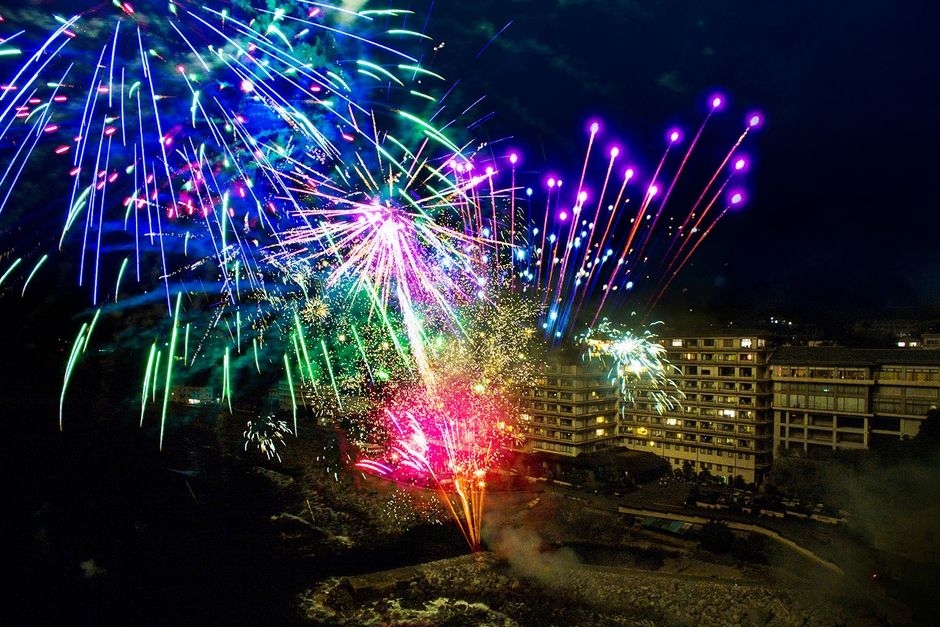 ホテル前から打上げを行う「銀水花火」は、夕食後のひとときにゆっくりくつろぎながら、館内から花火をお楽しみいただけます。