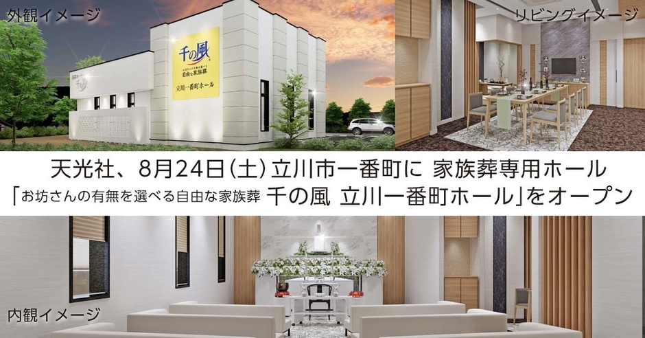 「天光社」ならびに「千の風」「糸」ブランドで葬儀式場を全国展開する、株式会社 天光社(本社:福岡県福岡市、代表取締役社長:江村 哲也、以下 当社)は、2024年8月24日(土)に1日1組貸切の家族葬専用ホール「お坊さんの有無を選べる自由な家族葬 千の風 立川一番町ホール」(以下 立川一番町ホール)を立川市一番町にオープンいたします。