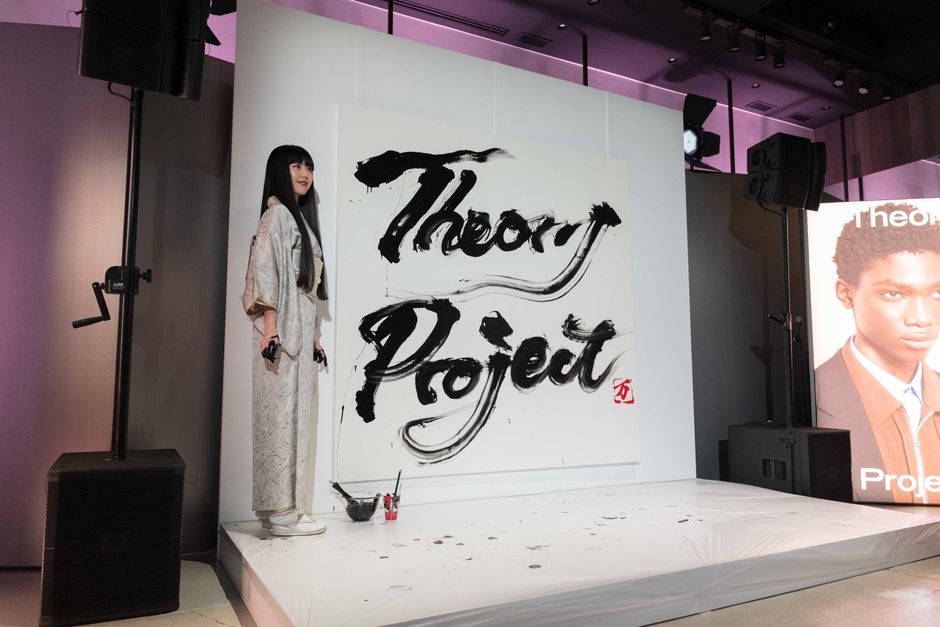 イベントでは、書道家 万美氏によるペイントパフォーマンスが行われ、カプセルコレクション名である「Theory Project」を描き会場を盛り上げました。描かれた作品は、セオリー青山店で4月3日(月)まで展示を行ないます。