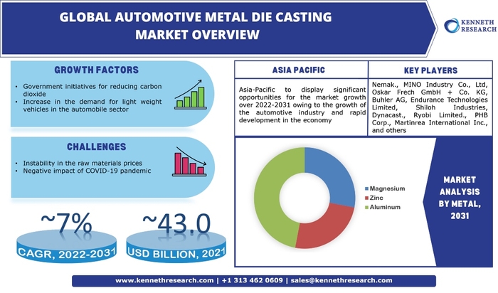リサーチ・ネスターの一部門であるケネス・リサーチは最近、「自動車用金属ダイカスト市場:世界の需要分析と機会見通し2031」と題する調査レポートを発表し、エンドユーザー、金属、地域別の市場セグメンテーションの観点から、世界の自動車ダイカスト市場の詳細な概要を提供しています。