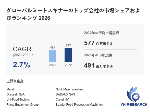 YHResearch調査チームの最新レポート「グローバルミートスキナーのトップ会社の市場シェアおよびランキング 2026」によると、2026年の491百万米ドルから2032年には577百万米ドルに成長し、2026年から2032年の間にCAGRは2.7%になると予測されています。