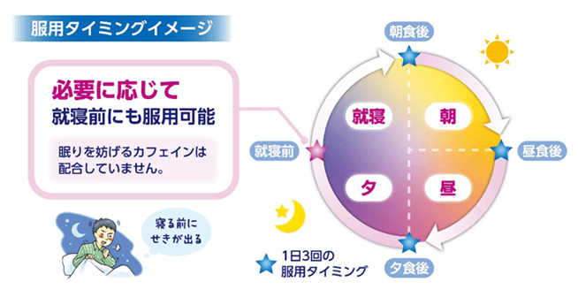 - 1日3回に加え、必要に応じて就寝前にも服用可能。つらいせきにもしっかり対処