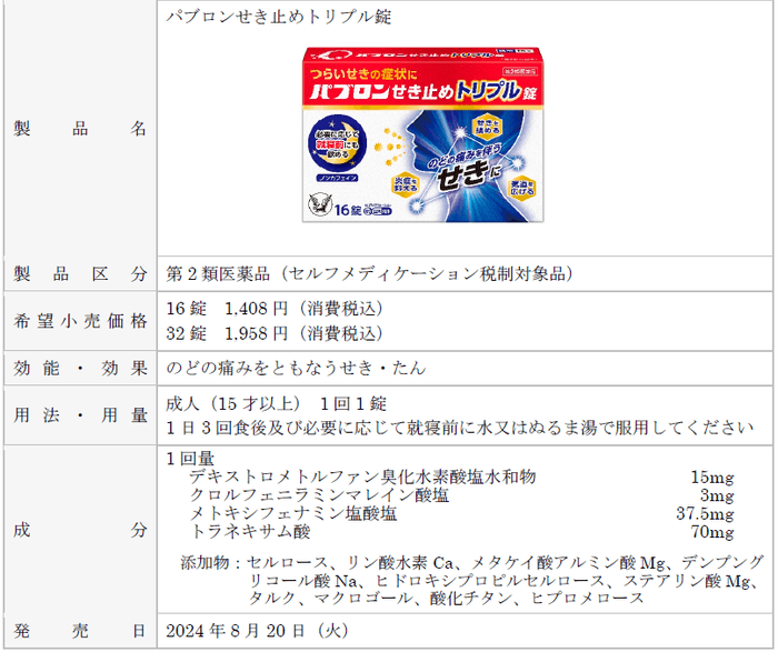 大正製薬株式会社[本社:東京都豊島区 社長:上原 茂]は、のどの痛みを伴うせきの症状に効果のある錠剤タイプのせき止め薬「パブロンせき止めトリプル錠」(第2類医薬品)を8月20日(火)に新発売いたします。