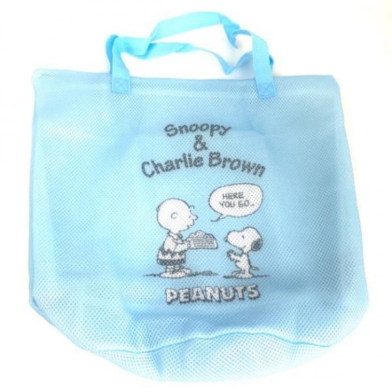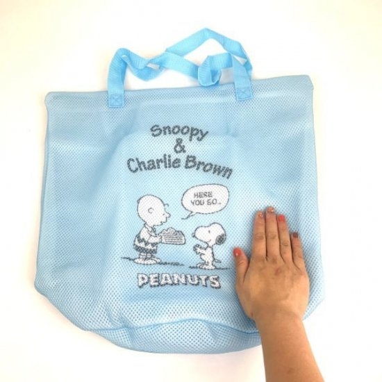厚めのメッシュ素材で作られたランドリーバッグ。裏表メッシュ素材です♪この時期にピッタリの青空のような青色は気分も爽やかにしてくれそう!真ん中のチャーリーブラウンとスヌーピーがポイントです。