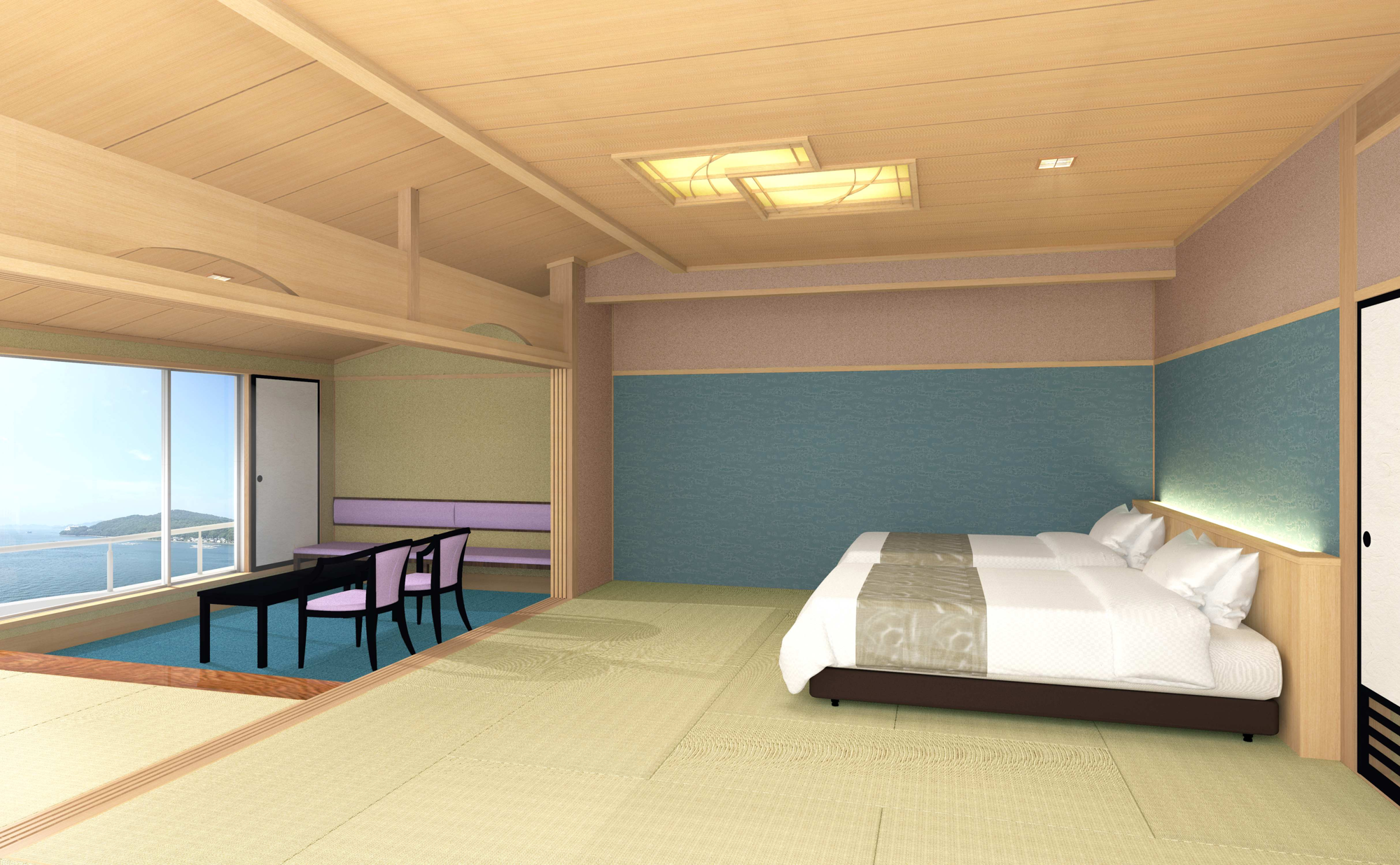 当ホテルは汀館、望館、岬亭の3つの館からなっており、汀館は広々としたハイグレードタイプの全63室からなる客室棟です。新しい客室は、畳のぬくもりを感じる空間になるよう和ベッドを導入し、ベッドに横になりながら窓の向こうに広がる穏やかな鳥羽湾の景色を眺め寛げることから「なごみ(和海)フロア」と名付けました。また、本客室はフロント階(7階)に位置し、レストランや大浴場「汀の湯」にもエレベーターでスムーズな移動が可能です。