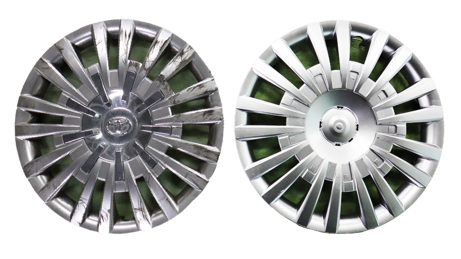 損傷したトヨタJPNTAXI用タイヤ・ホイールキャップを、塗装剥離専用機械「サンドブラスター」を使用し、短時間で表面を削り、塗装を施すことで新品同様にするサービスです。