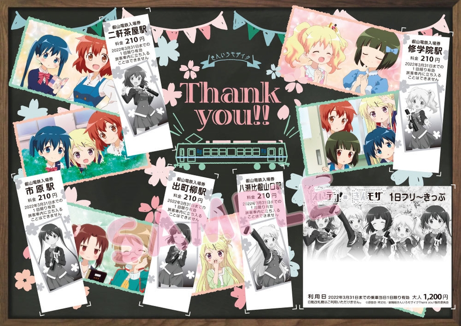 「きんいろモザイクThank you!!」のキャラクターが描かれた硬券タイプの1日乗車券、特別入場券・特典台紙・特典クリアファイルのセットを以下の通り発売します。