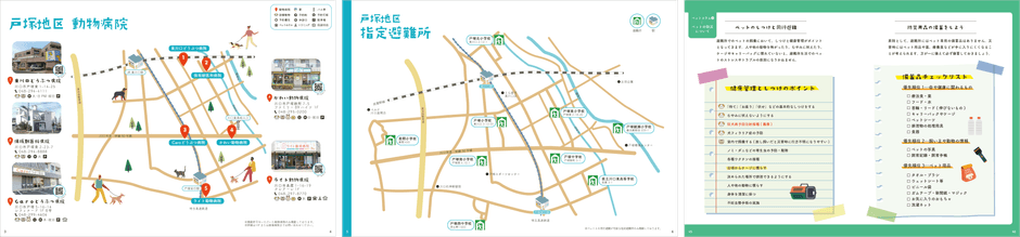 第3版となる今回は、ペットとの同行避難が可能な指定避難所を地区ごとにマップとして新しく掲載し、ペットコラムにもペットの防災に関する記事を追加いたしました。また、動物病院の詳細全てをアイコン化し1ページにまとめ、全体的にカラフルで明るいデザインにしたことで目につきやすく、思わず手に取りたくなるようなマップとなっております。