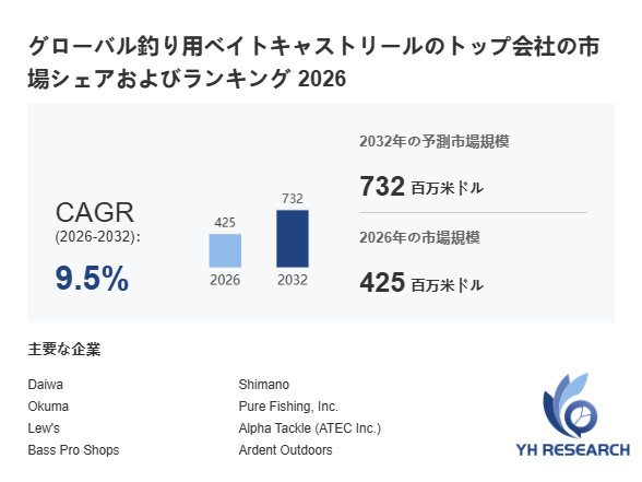 YHResearch調査チームの最新レポート「グローバル釣り用ベイトキャストリールのトップ会社の市場シェアおよびランキング 2026」によると、2026年の425百万米ドルから2032年には732百万米ドルに成長し、2026年から2032年の間にCAGRは9.5%になると予測されています。
