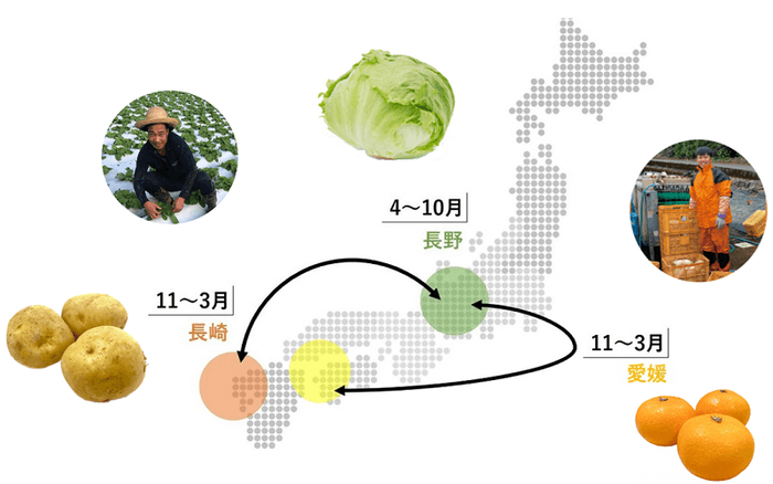 「産地間人材リレー」は、農作物の収穫時期と共に繁忙期と閑散期が入れ替わる日本全国の産地をつなげ、農家によって異なっていた賃金などの雇用条件や生活環境の整備を図り、日本各地での労働力をリレーする仕組みづくりに成功しました。これにより、繁忙期を迎える農家では、2年目以降は経験者が働いてくれることになり、仕事を教えるストレスが軽減し、農業技術の高い人材確保が実現、生産計画も立てやすくなります。働く側にとっても、1年中働けるので「稼ぎたい」という目的が達成され、幅広い農業知識を得ることができる、双方にメリットがある仕組みになっています。
