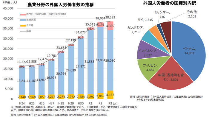 農業分野の外国人労働者数、この5年で1.6倍増、国籍別でベトナムが全体の4割を占めトップ