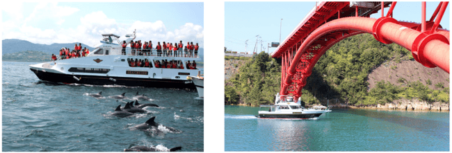 ◆目玉は何と言っても<イルカウォッチング>。その遭遇率はなんと98%!専門のガイドが野生のバンドウイルカの生態や行動の解説もしてくれるので、楽しいだけでなく「学べる」クルーズタイムが楽しめます。他にも<天草五橋クルージングコース>もあり、海の上から仰ぎ見る天草五橋は陸上から眺めるのとはまた違った表情を楽しませてくれます。