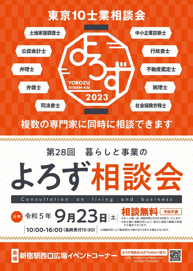 よろず相談実行委員会(令和5年度幹事会:東京土地家屋調査士会、所在地:東京都千代田区)は、2023年9月23日(土)に新宿駅西口広場イベントコーナーで、東京の10士業・13団体が無料で応じる相談会「第28回暮らしと事業のよろず相談会」を開催いたします。