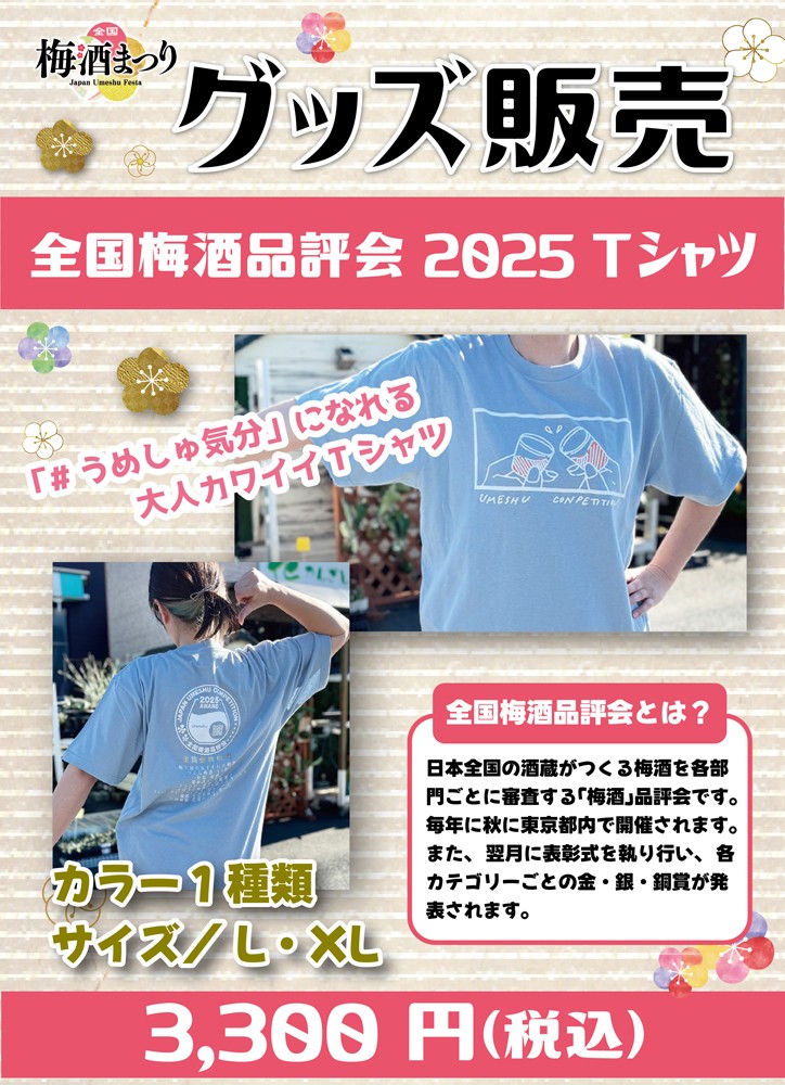 トートバッグやタンブラー、ショットグラスのほか、「全国梅酒品評会2025」記念Tシャツも用意しています。