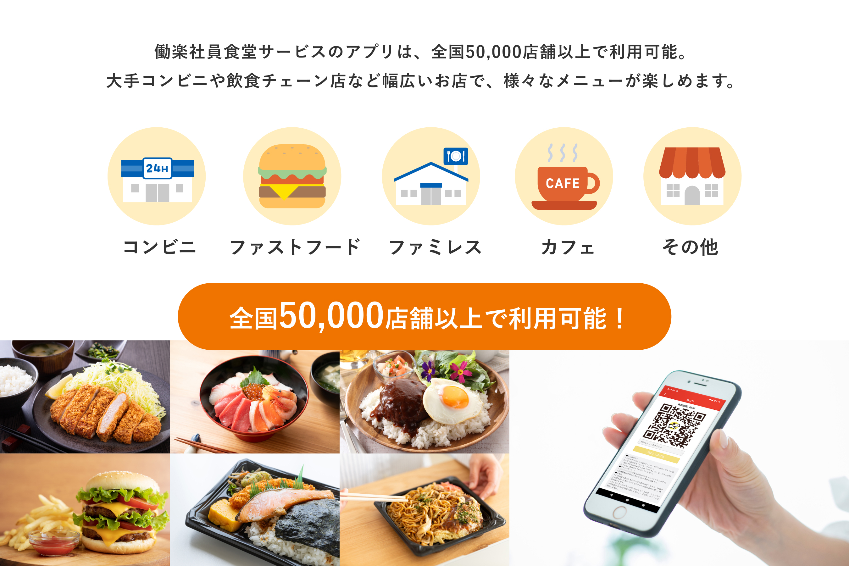 従業員は専用アプリをインストールするだけで、全国50,000店舗以上の大手コンビニエンスストアや飲食チェーン店が社員食堂代わりに利用できます。