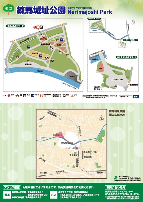 練馬城址公園は、遊園地「としまえん」跡地を中心に整備中の公園です。公園の中心部には石神井川が流れており、2023年5月にエントランス交流ゾーン、川辺の散策ゾーン、花のふれあいゾーンが開園します。(一部整備中)