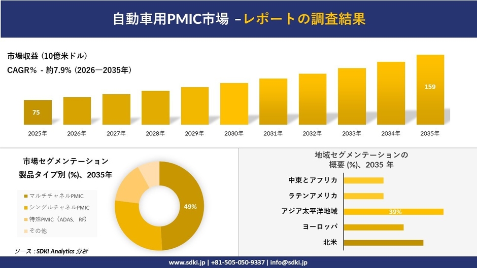 提出日 (2026年04月17)、SDKI Analytics(本社:渋谷区、東京都)は、2026年と2035年の予測期間を対象とした「自動車用PMIC市場」に関する調査を実施しました。