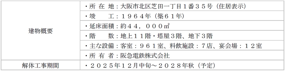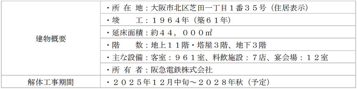 旧大阪新阪急ホテルは、1964年8月8日の開業以来約60年間にわたり多くのお客様にご愛顧いただき、2025年1月4日のご宿泊利用をもって営業を終了しましたが、阪急電鉄株式会社および阪急阪神不動産株式会社は、2025年12月中旬から同建物の解体工事に着手することとなりましたので、お知らせします。
