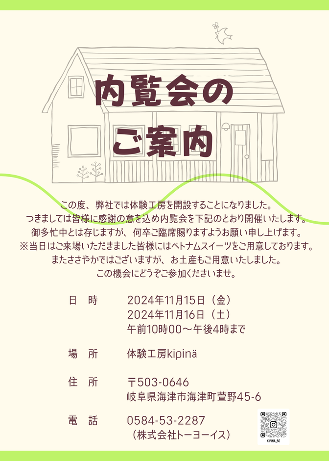 イスの製造の一貫生産を行う株式会社トーヨーイス(所在地:岐阜県海津市、代表取締役社長:伊藤 友美)は、モノづくり体験工房「Kipina」を2024年12月1日にオープンします。