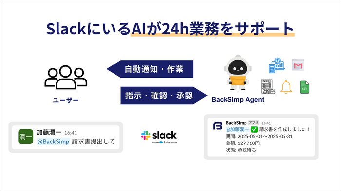 株式会社モクジツ(本社:山口県宇部市、代表取締役:加藤 潤一)は、企業のためのフリーランス管理サービス「BackSimp(バックシンプ)」において、Slack上で稼働・納品・請求・経費処理などを直接実行できる新機能「BackSimp Agent(バックシンプ・エージェント)」の事前予約受付を2025年7月30日に開始しました。