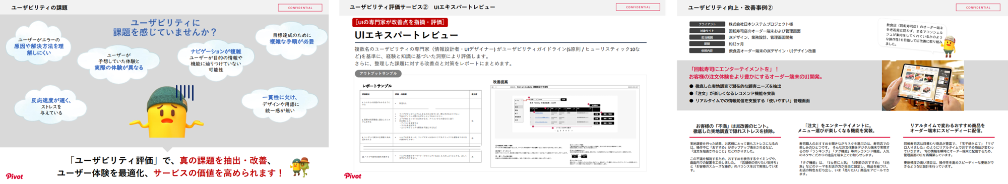 株式会社PIVOT(URL: https://pivot.jp/ 所在地:東京都港区、代表取締役社長:宮嵜 泰成)では、事業目標や利用者、利用シーンを整理したうえで課題を可視化し、確実な改善につなげる「ユーザビリティ評価」を提供しています。