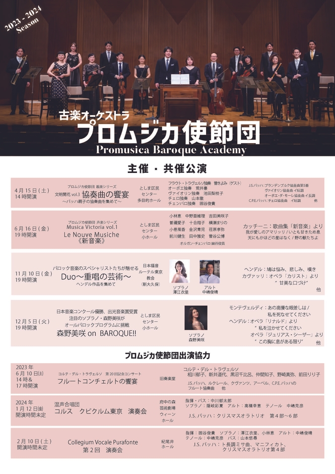 プロムジカ・コンティヌオ株式会社(所在地:豊島区池袋、代表取締役:圓谷 俊貴)が運営する古楽団体「プロムジカ使節団 <Promusica Baroque Academy>」の2023年度の年間スケジュールが決定しました。