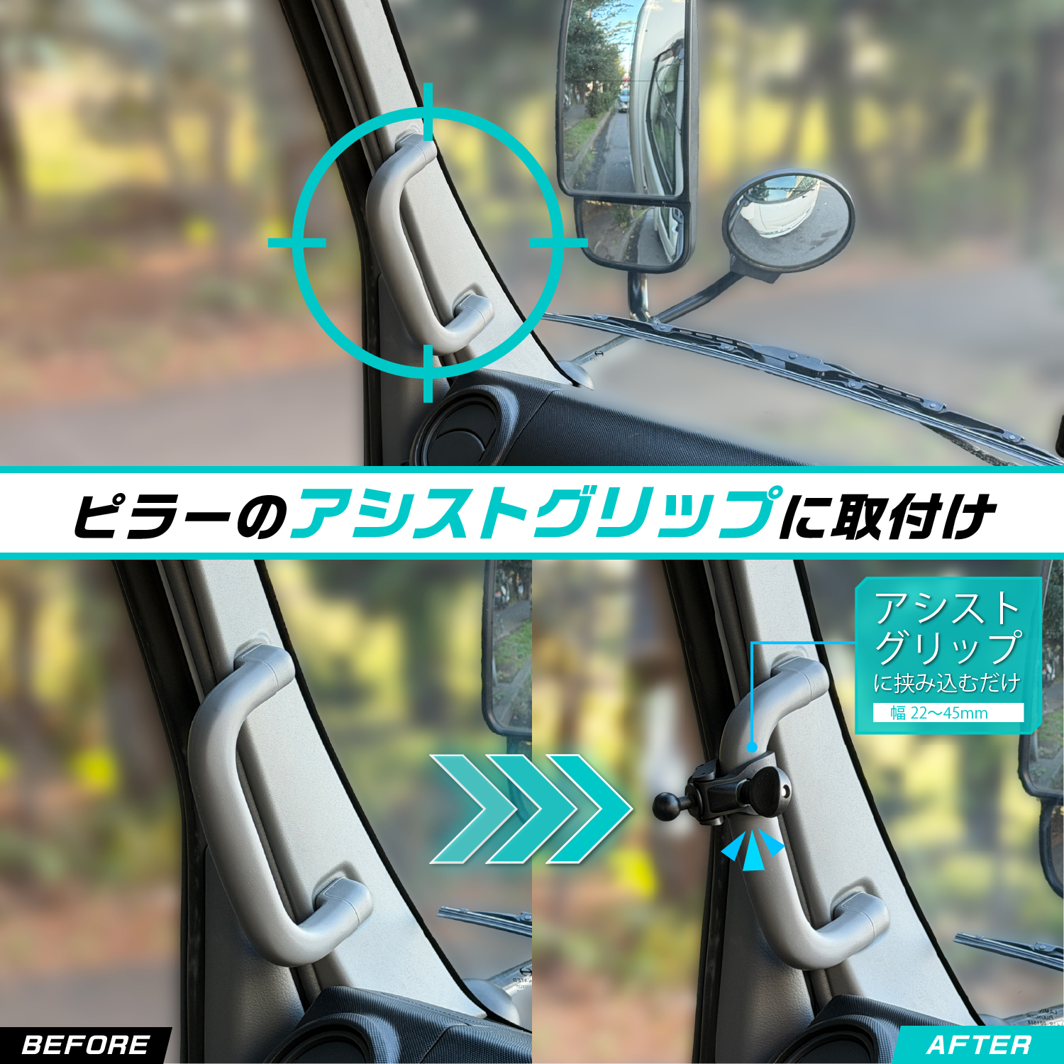 ● DC24V車のトラックなどで、後方の距離が把握しにくい車両に、見えない死角をカバーします。広いピラーアシストグリップ(幅22~45mm)に取り付けられるデジタルサイドミラーです。視野角の縦型モニターにより、死角をしっかりとカバーし、巻き込みや自損事故を防ぎます。