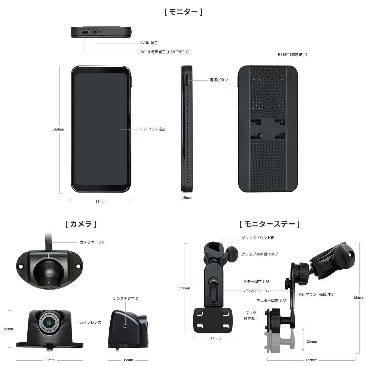 ● スマホサイズの6.25インチ液晶(112万画素)を採用し、色彩や路面の障害物をはっきりと確認でき、死角の状況を正確に把握できます。
