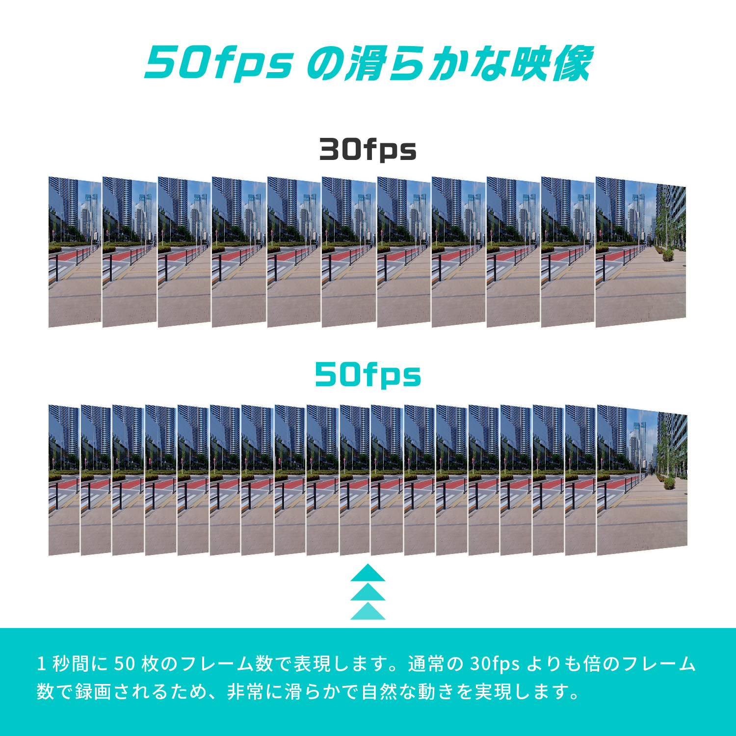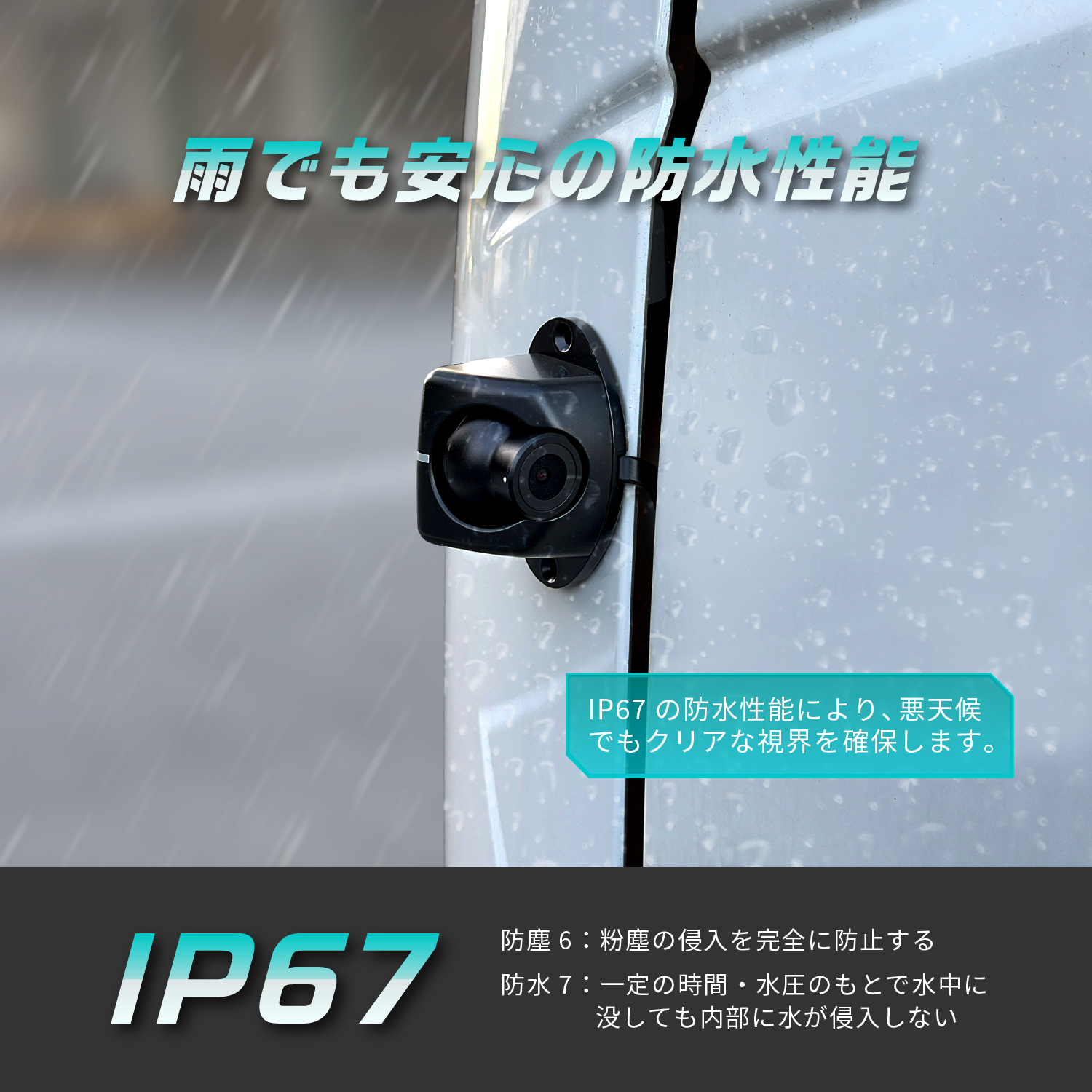 ● カメラレンズは角度調整が可能で、撮影角度を微調整できます。さらに、高フレームチューニング(50fps)により、滑らかな映像を実現し、IP67防水仕様で雨にも強い設計です。