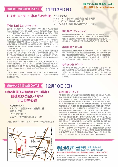 メンバーそれぞれがニューヨーク、パリ、ベルリンの三都と東京に活動拠点を持ち、それを特色としたユニークなプログラミングに定評があるピアノ三重奏団【トリオ ソ・ラ】 は、デビュー以来「才色兼備の閏秀演奏家によるピアノ三重奏」「名手三人のノリのいい名演は別格」「素晴らしく練れた名演」と各音楽誌で高い評価を受けています。定番の名曲からレアな作品の発掘、日本の若手作曲家に作品を委託するなど、日本内外でオリジナリティ溢れる演奏活動を行なっている彼らが、2023年秋の鎌倉に再登場!