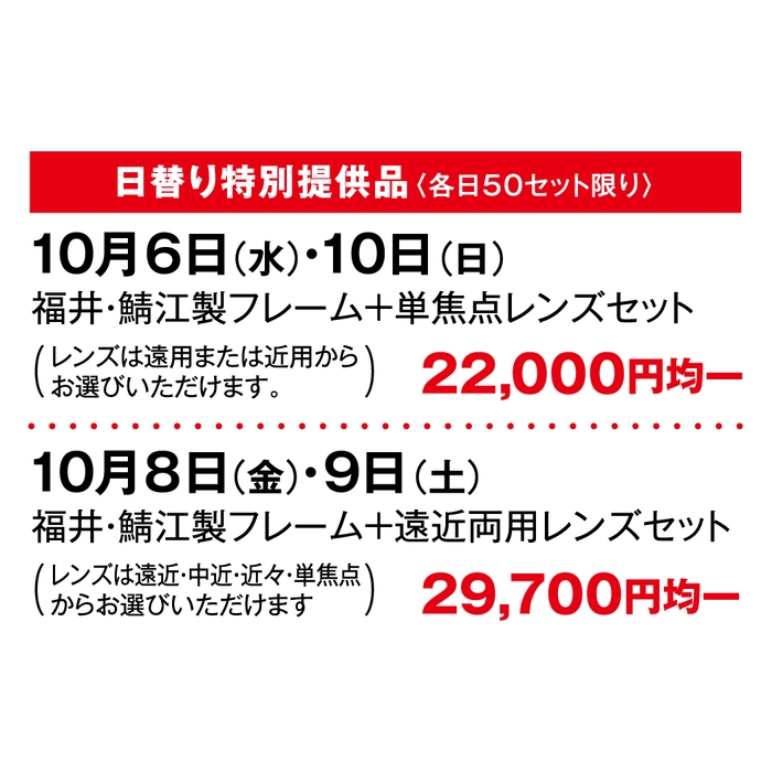 福井・鯖江製フレーム+レンズセットを各日50セット限り、お買得な均一価格にてご用意いたします。