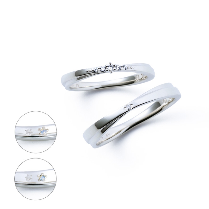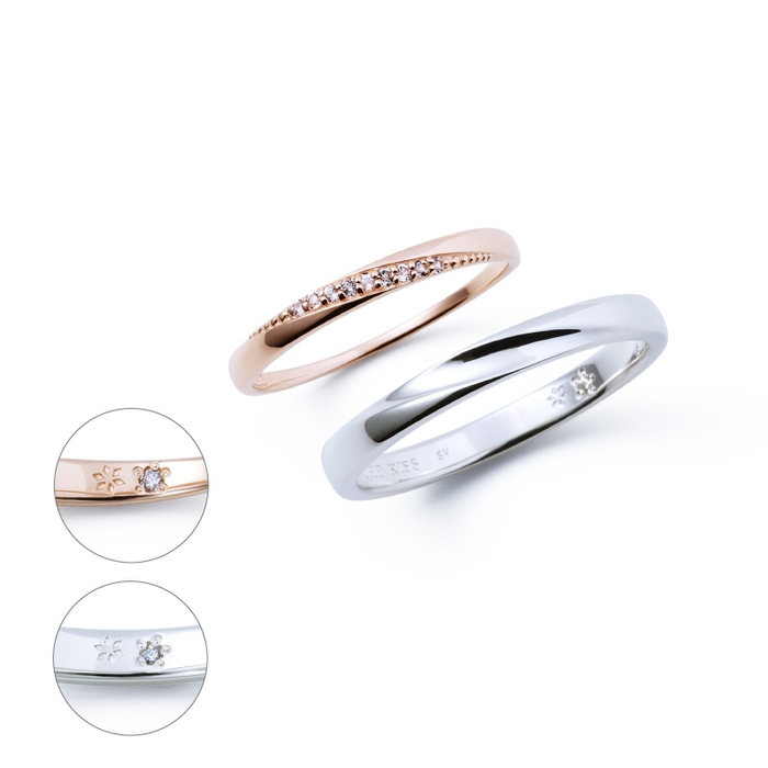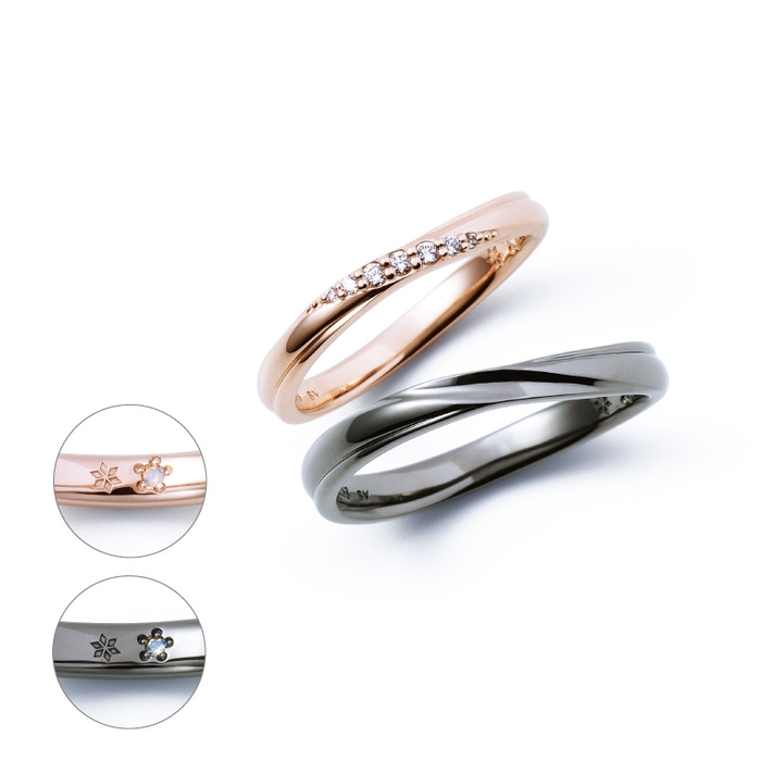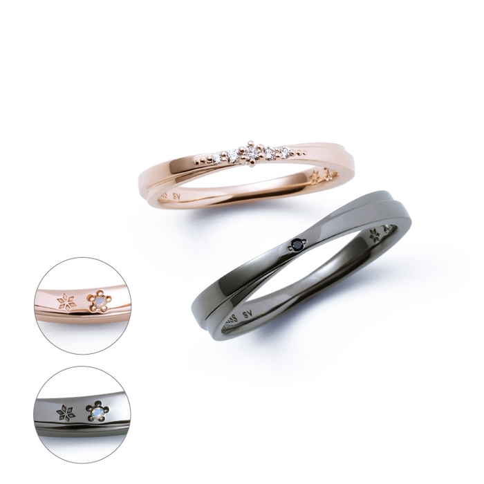 それぞれのリングの内側には、「愛と幸福」を意味する雪の結晶モチーフとダイヤモンドがデザインされています。