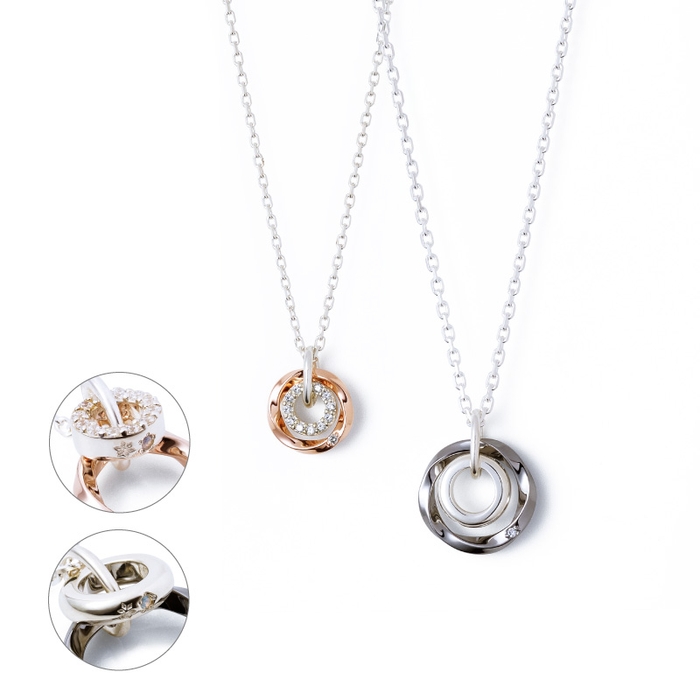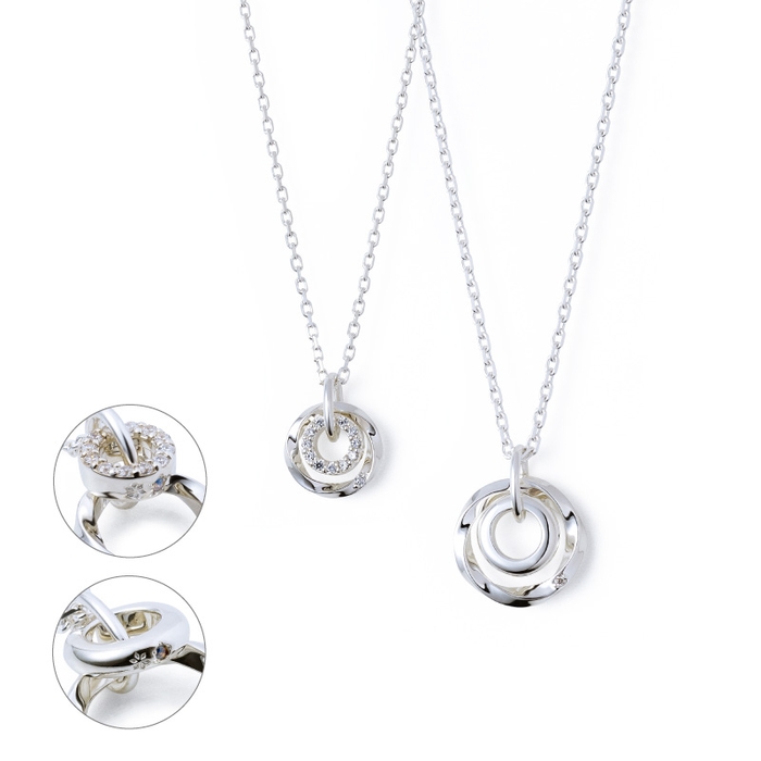 2つのデザインのそれぞれ異なるきらめきが魅力のダブルリングのペアネックレス。