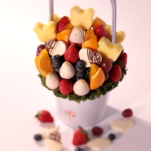 クマ型のパイナップルや、ホワイトチョコでコーティングしたイチゴ、もちろん旬のイチゴもフレッシュにアレンジメントし、女性に喜ばれるデザインに仕上げました。