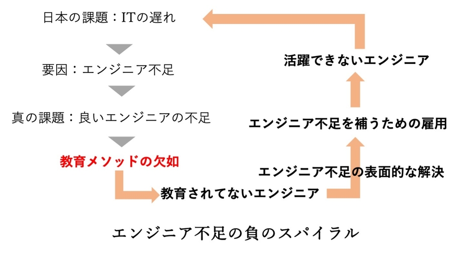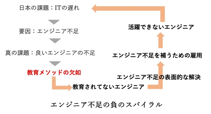 しかし日本には「良いエンジニアの定義」がなく、その良いエンジニアを育成するための教育メソッドも確かではありません。さらには良いエンジニアになるための教育を受けていなくても、エンジニア不足を背景として雇用が生まれていました。その結果、プロジェクトが顧客の思うように進行せず、エンジニア不足も解消されない状況が生まれていました。