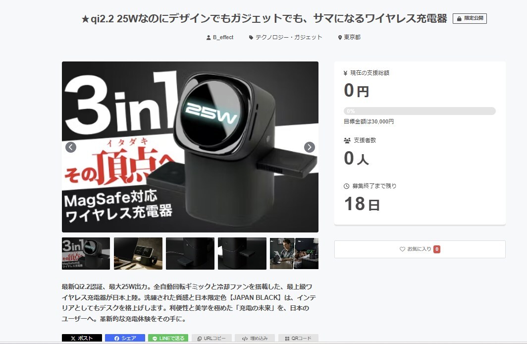 合同会社b-effectは、2026年1月16日(金)から1月31日(土)までのわずか16日間限定で、応援購入サービス「CAMPFIRE」にて、最新Qi2規格・最大25W出力対応の「次世代3-in-1ワイヤレス急速充電器」の先行販売を実施いたします。