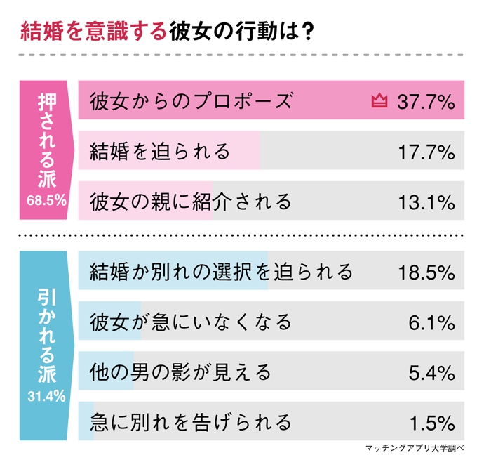 全体を見てみると、逆プロポーズや結婚を迫られるなど「彼女から押されて結婚を意識する」男性が約70%と多数でした。しかし、彼女から結婚か別れの選択を迫られるなど「彼女が引いてみることで結婚を意識する」という男性も少ないとはいえません。