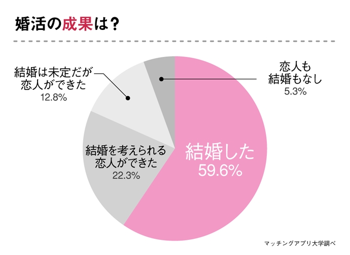 「結婚を考えられる恋人ができた」「結婚は未定だが恋人ができた」の回答もあわせると、約95%もの女性が婚活でなんらかの成果を得ていることが分かります。