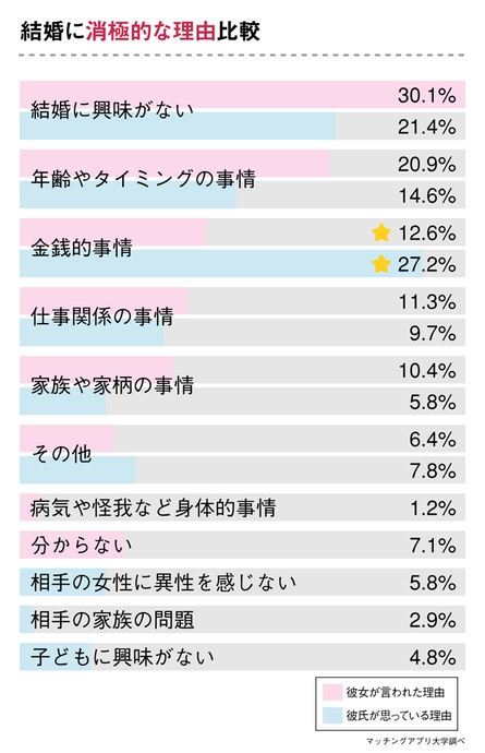 一方、彼女が彼氏に言われた理由で1番多かったのは「結婚に興味がない」です。彼女が聞いた理由として「金銭的な事情」は約13%に留まっているため、ここに大きなギャップがあることが分かります。
