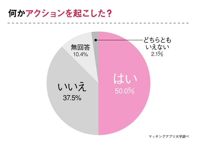 結婚する気がない彼氏と結婚した女性に「結婚のために、彼に対して何かアクションを起こしたか」と聞いてみたところ、50%の女性が「アクションを起こした」と回答しました。