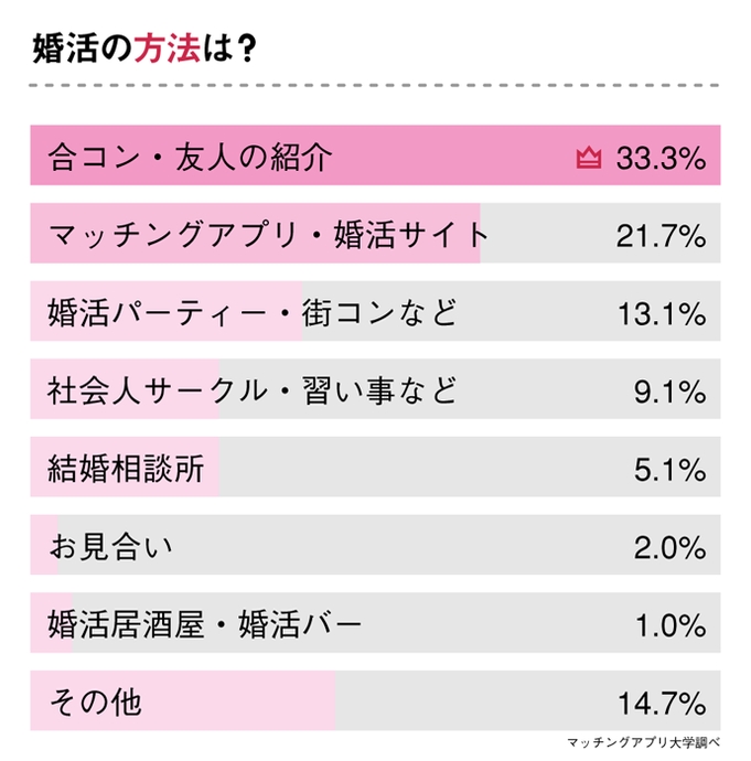 婚活手段として1番人気だったのは「合コン・友達の紹介」でした。次に多かったのは「マッチングアプリ・婚活サイト」で約21.7%です。