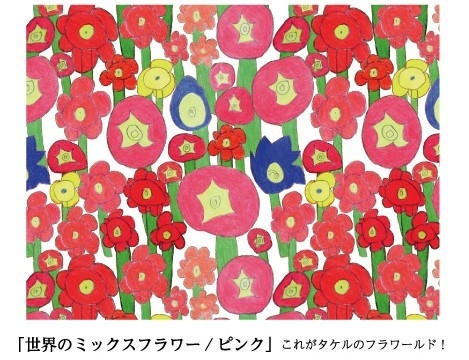 1998年・大阪生まれ。吉川豪留さんは、好きなモチーフである花や昆虫、列車等を色鉛筆を使って画面の隅々まで丁寧に塗り込んで制作します。一見、風車のようにも見える独特にデフォルメされた花は、彼ならではの世界観です。複数の原画に描かれた同系色の花を集めてデザイナーがこの世界観をギュッと凝縮しました。