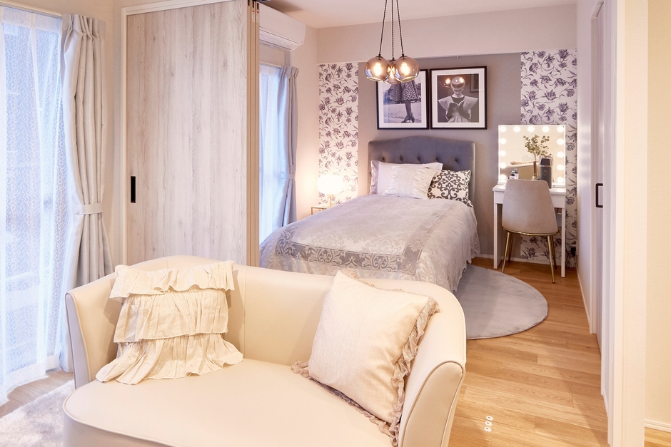 部屋全体を落ち着いたグレーカラーで仕上げたベッドルーム。ベッドボードのデザインが個性的なベッドで日々の疲れを癒します。