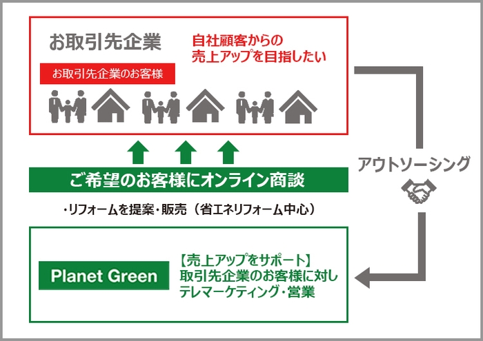 プラネットグリーンは、自社顧客からの売上アップを目指す企業に対し、住宅リフォームのセールス&マーケティングBPOサービスを提供しています。(成功報酬制・導入費用/ランニングコスト無料)主要取引先は、大手電力会社や大手ガソリンスタンド会社、クルーズ船運営会社など多岐にわたります。コロナ禍で営業活動を自粛する動きがある中、オンライン商談を活用する当社に、自社顧客へのアプローチを業務委託することで、営業活動を止めることなく前に進むことが可能です。