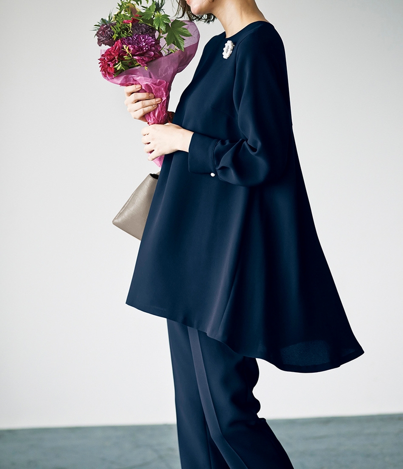 今回、アンケート結果を参考に開発したスーツは、デザインや着心地を細部までこだわりました。トップスのチュニックブラウスは、前後差があるデザインのため体型をカバーしながら美しいシルエットを実現しました。パンツは後ろゴムのラクな履き心地で、裾へ向かって細くスッキリ見えるワンタックのテーパードパンツです。