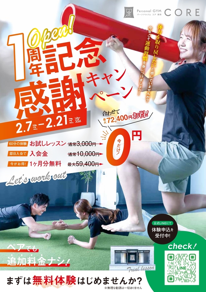 ファンクショナルトレーニングを軸とする福岡県福岡市中央区のパーソナルジムコア薬院は、2025年1月でオープン1周年を迎えた記念として「1周年記念感謝キャンペーン」を2月7日~2月21日に開催します。