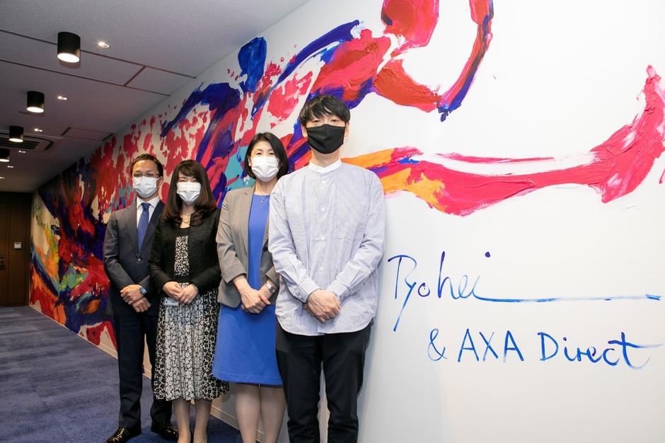右から ウォールアート デザイン 現代絵師 山下良平氏、アクサ損害保険株式会社(アクサダイレクト) 取締役デピュティCEO 上級執行役員CCFO 佐伯美奈子、同社 上級執行役員CTO 森田恭子、同社 上級執行役員CHRO 橋本 晃