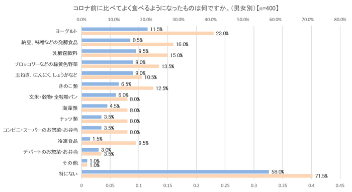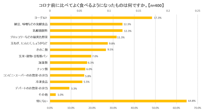◆コロナ前に比べてよく食べるようになったものは、ヨーグルト(17.3%)に続き、納豆、味噌などの発酵食品(12.3%)、乳酸菌飲料(12.3%)がランクイン